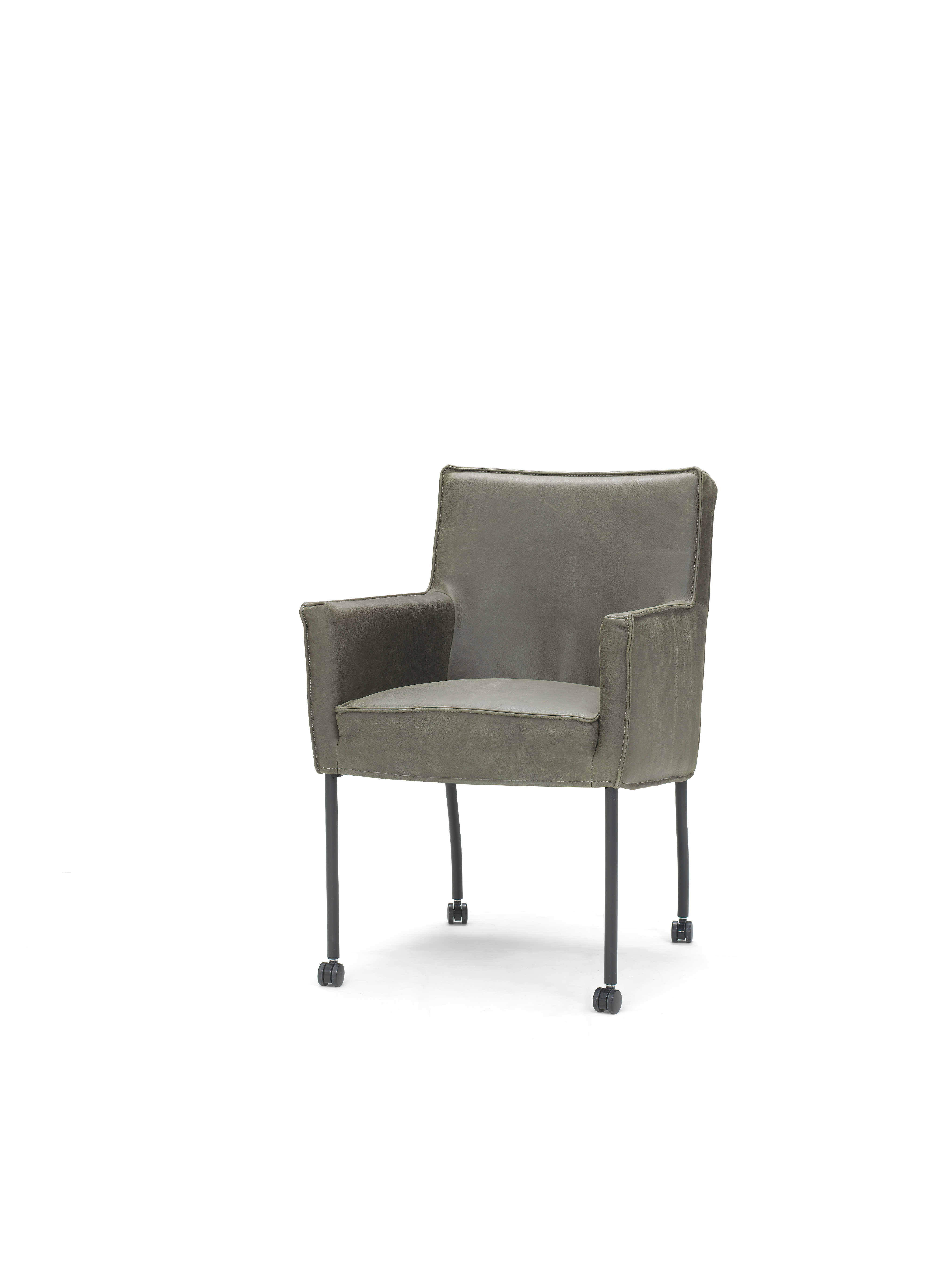 Eetkamerstoel Door is een heerlijke massieve fauteuil met heerlijk zitcomfort. De fauteuil heeft een rechte vormgeving met een stoer opstaand stiksel. De poten van eetkamerstoel Door zijn van zwart metaal en kunnen worden voorzien van 3 soorten wielen of gewoon vaste poten.