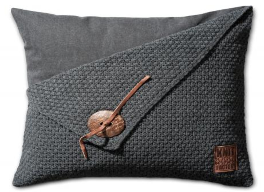 Kussen “Gerstekorrel” is er in de kleuren antraciet, licht grijs, beige, jeans, groen en wit. De knoop is gemaakt van kokosnoot.