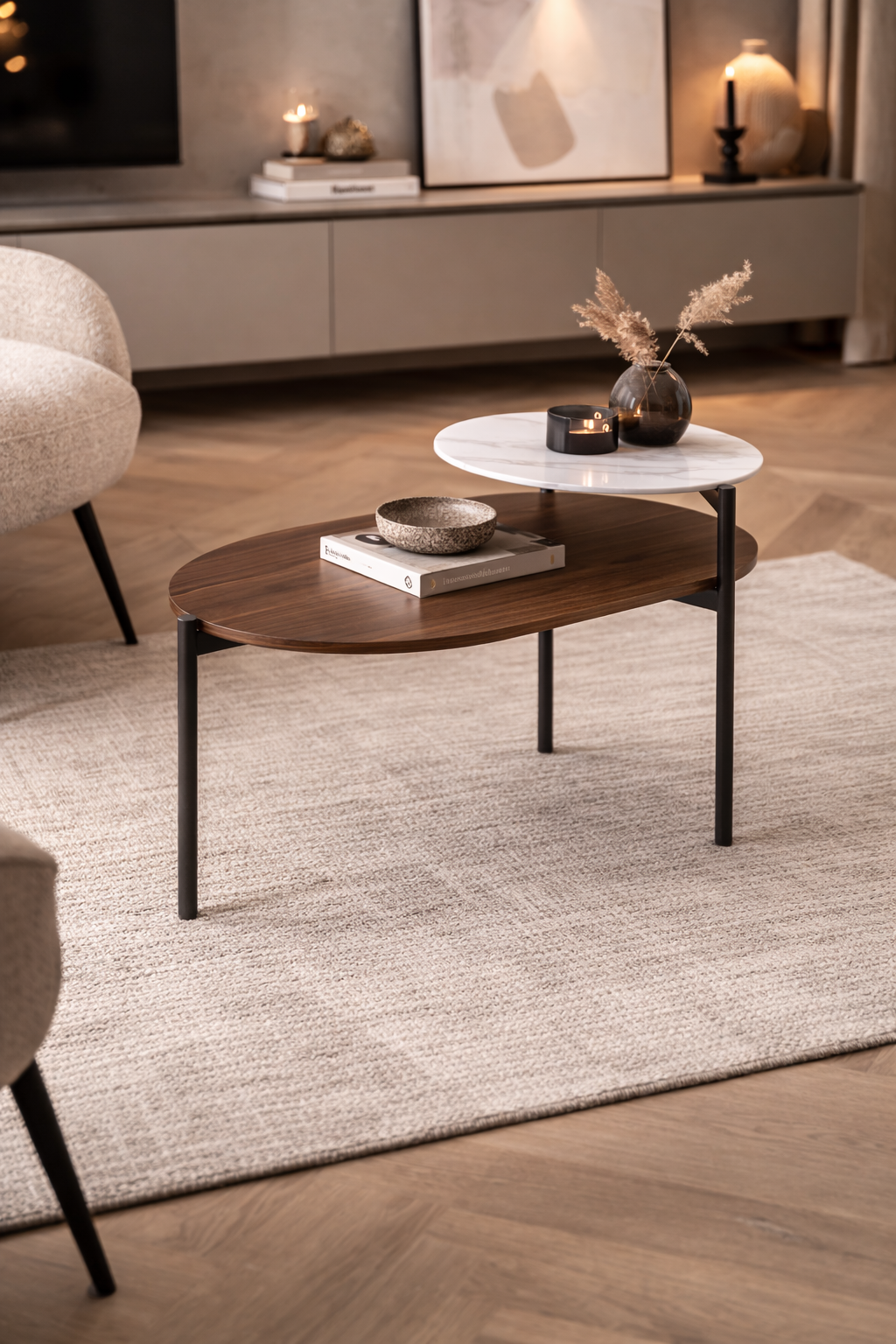 Salontafel O-rizon van het Griekse merk al2 is een verfijnd designstuk dat functionaliteit en elegantie perfect combineert. Het speelse ontwerp met meerdere niveaus creëert een luchtig en dynamisch geheel. De combinatie van een glazen blad met een houten of gelakte top geeft de tafel een moderne en stijlvolle uitstraling. Dankzij de keuze uit verschillende maten, materialen en kleuren kunt u de O-rizon geheel naar eigen wens samenstellen. Zo ontstaat een unieke salontafel die zowel praktisch als decoratief is en moeiteloos een eyecatcher vormt in uw interieur.