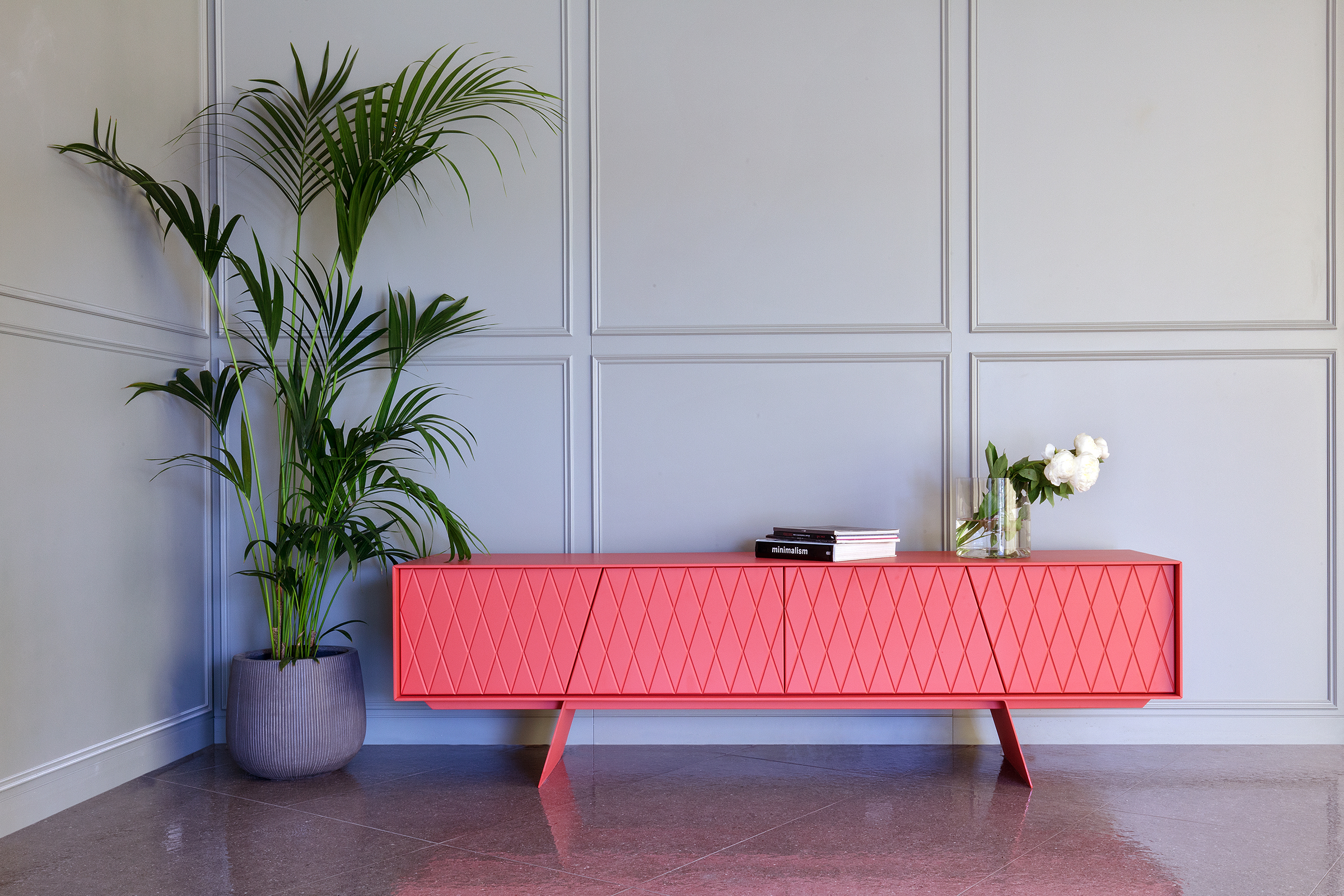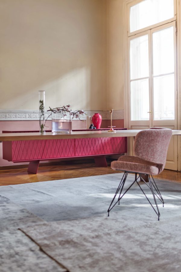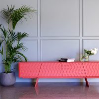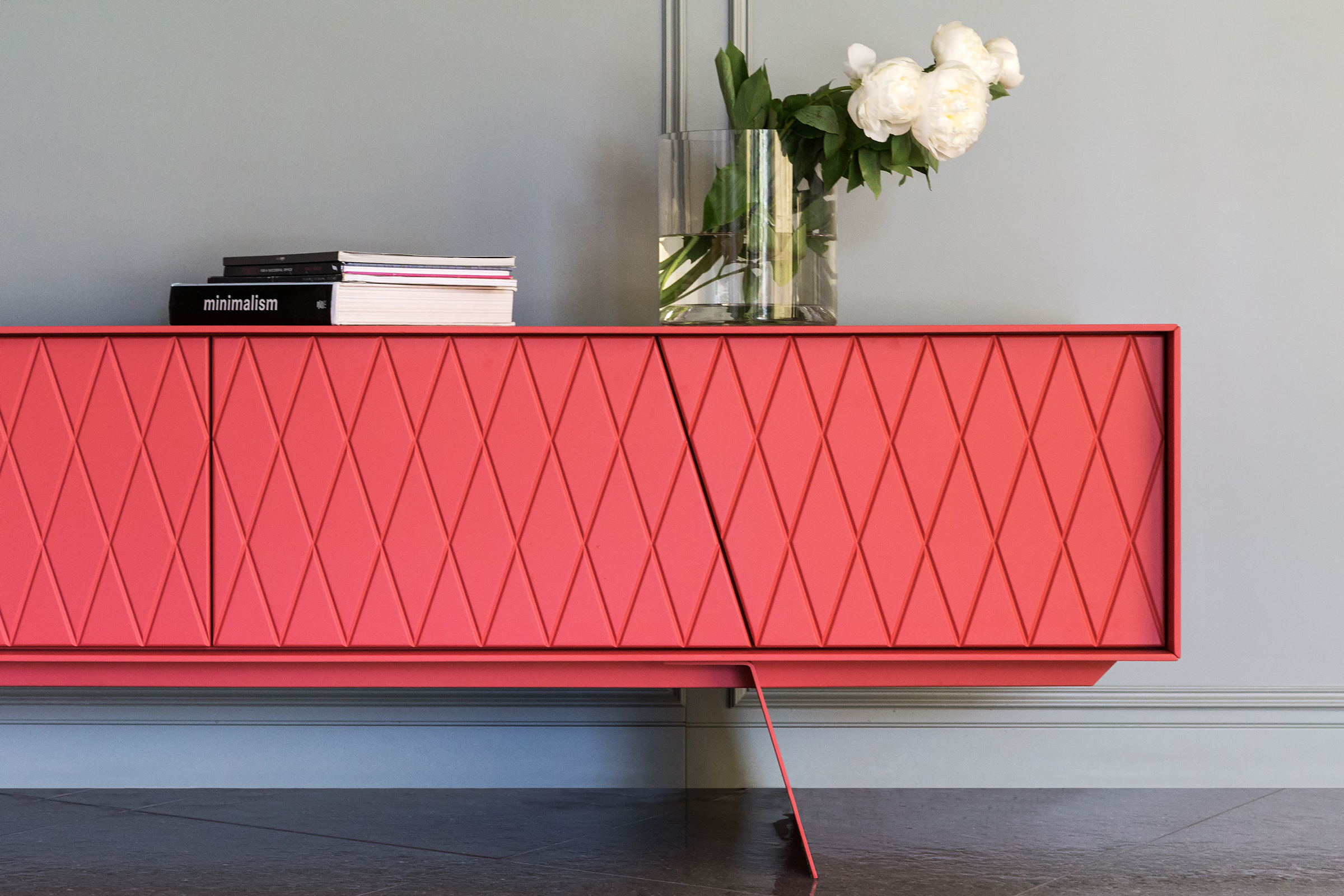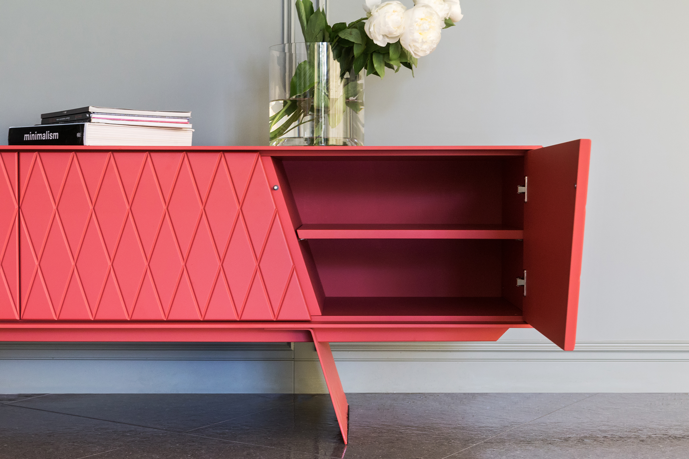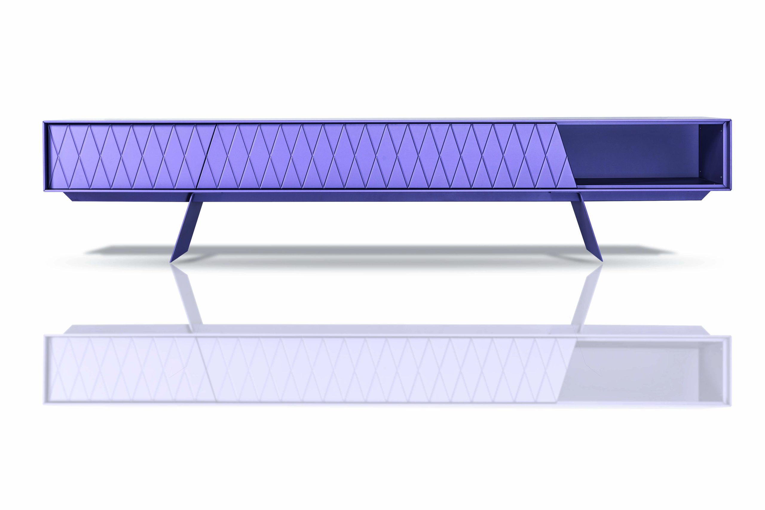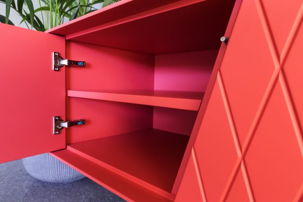 De e-klipse 003 is een stijlvol dressoir met een speels reliëf in de deurtjes. Er zit een mooie lijn in de vorm van de deurtjes en de poten van het dressoir. De deurtjes zijn altijd gelakt, de rest van de kast kent enkele keuzemogelijkheden.