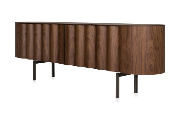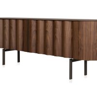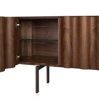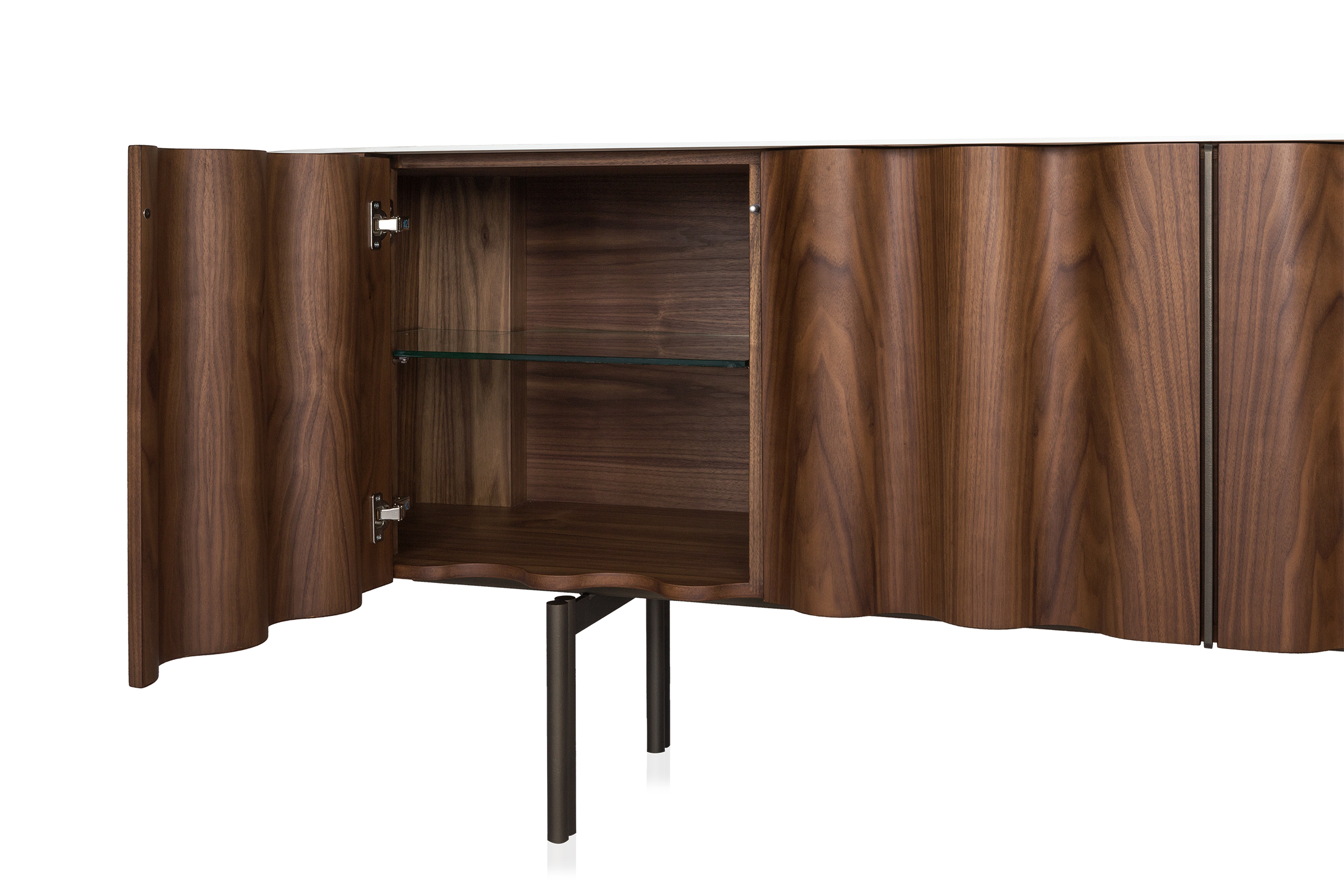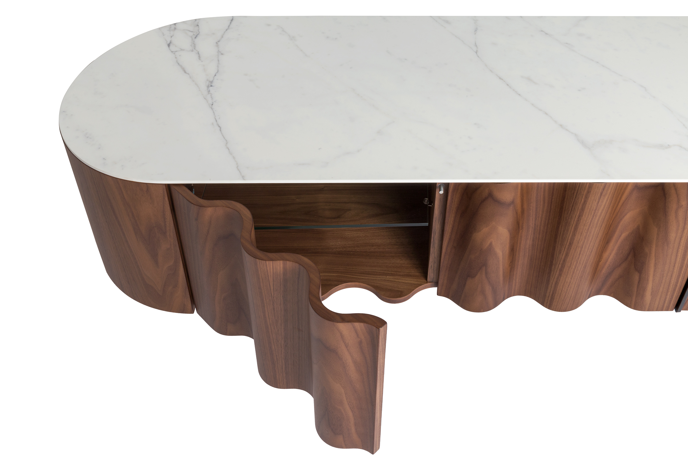 Het dressoir E-lit van het Griekse merk al2 is een uniek designmeubel met een elegant golfpatroon, verkrijgbaar in eiken- of notenfineer, rijke lakkleuren en optioneel een maxfine top. Met 4 push-pull deuren, glazen legplanken en stijlvolle metalen accenten biedt dit dressoir niet alleen volop opbergruimte, maar ook eindeloze mogelijkheden om materialen en kleuren te combineren voor een persoonlijke uitstraling