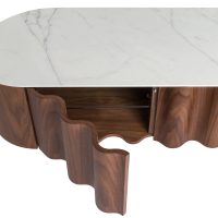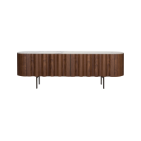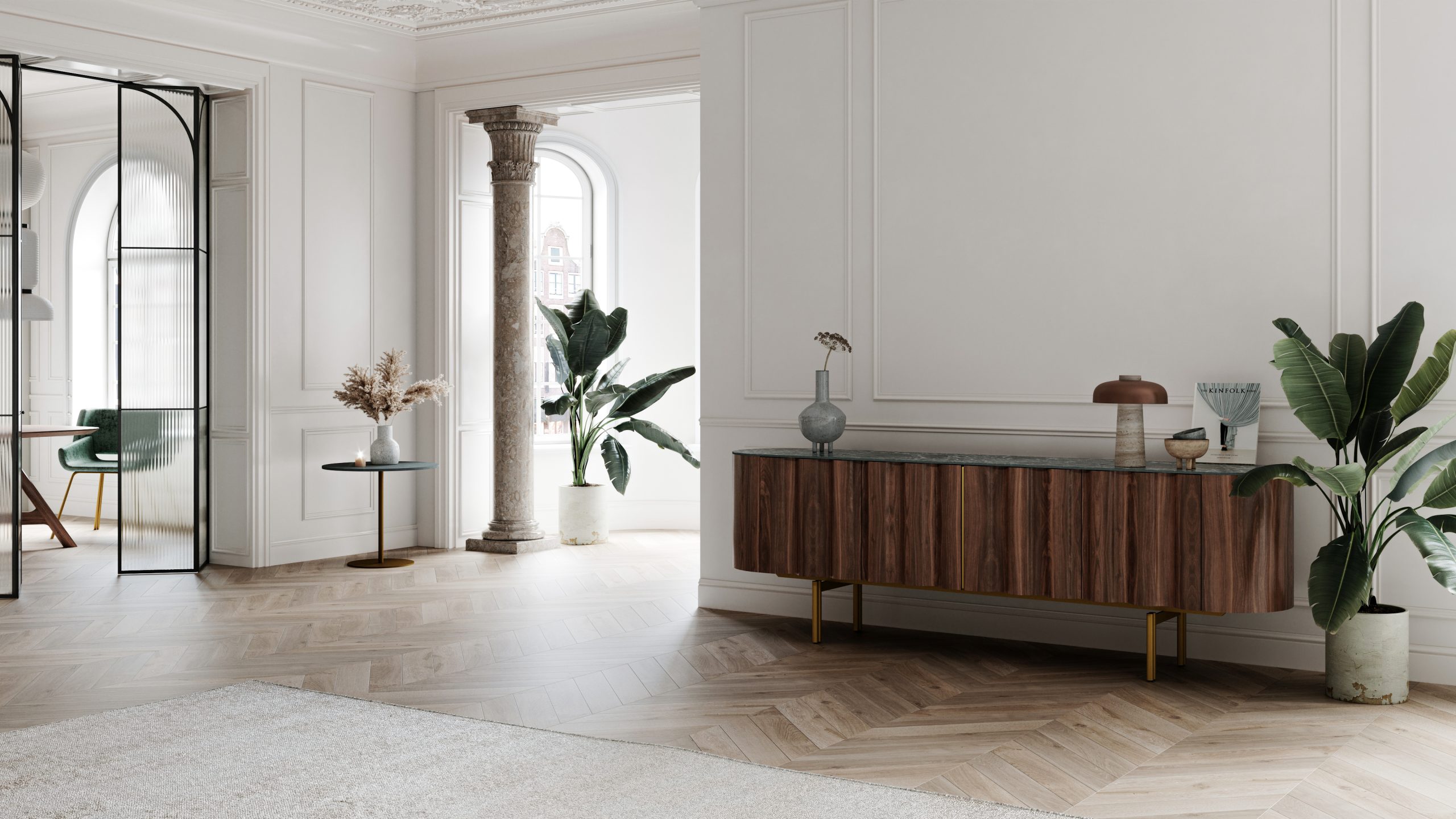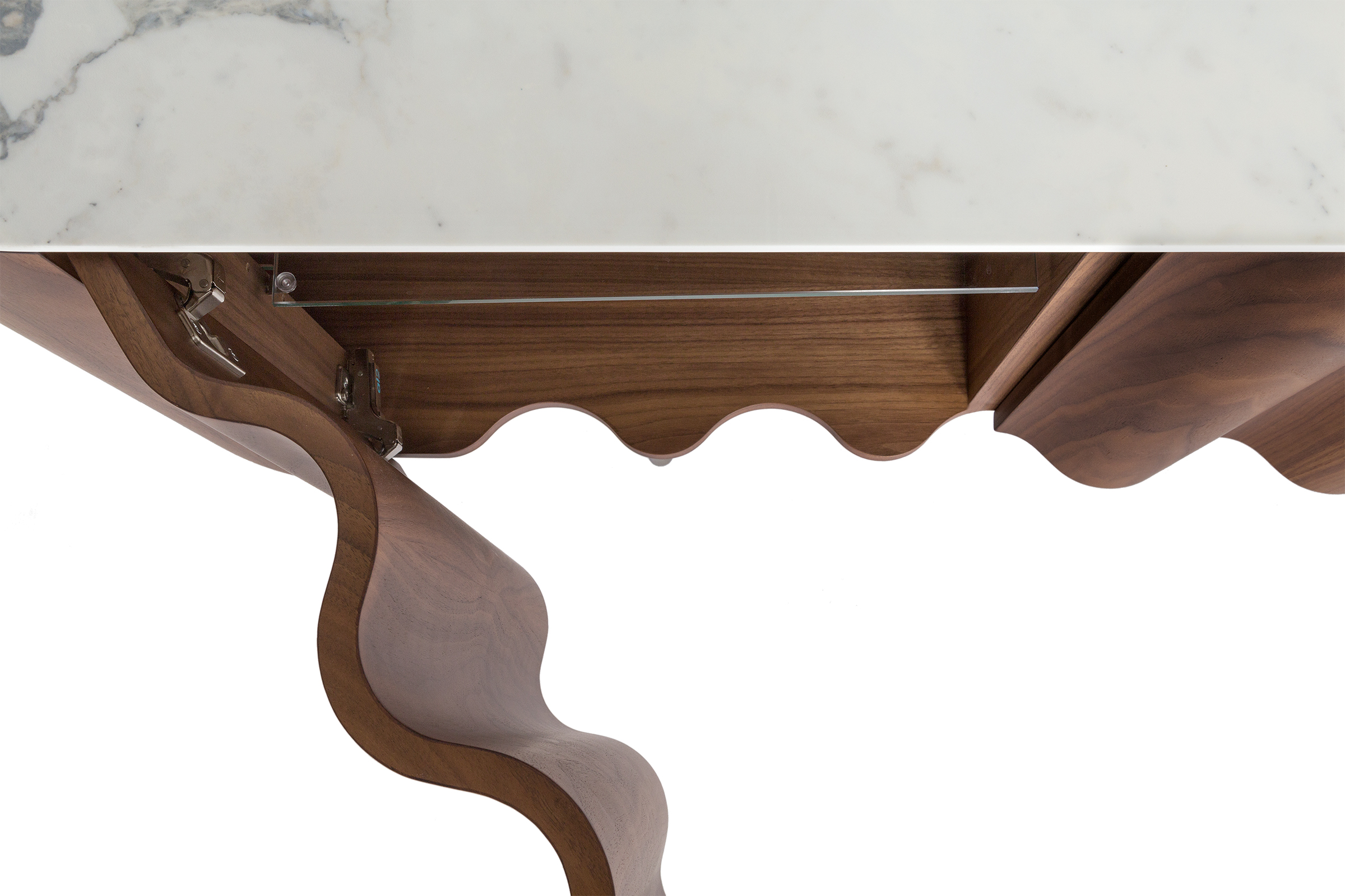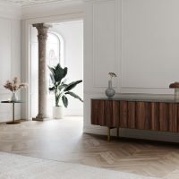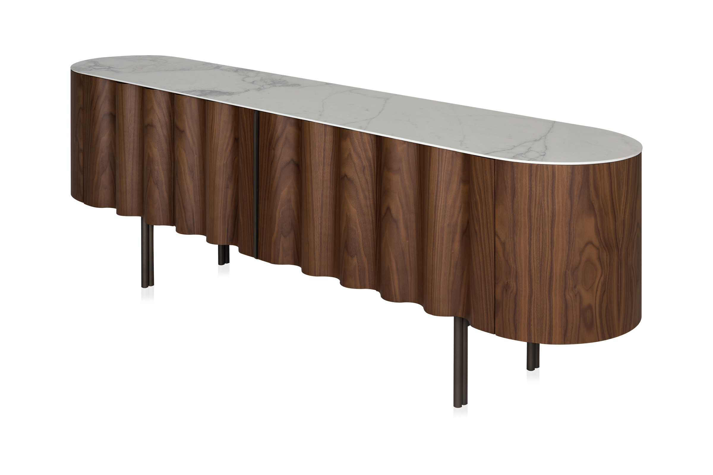 Het dressoir E-lit van het Griekse merk al2 is een uniek designmeubel met een elegant golfpatroon, verkrijgbaar in eiken- of notenfineer, rijke lakkleuren en optioneel een maxfine top. Met 4 push-pull deuren, glazen legplanken en stijlvolle metalen accenten biedt dit dressoir niet alleen volop opbergruimte, maar ook eindeloze mogelijkheden om materialen en kleuren te combineren voor een persoonlijke uitstraling