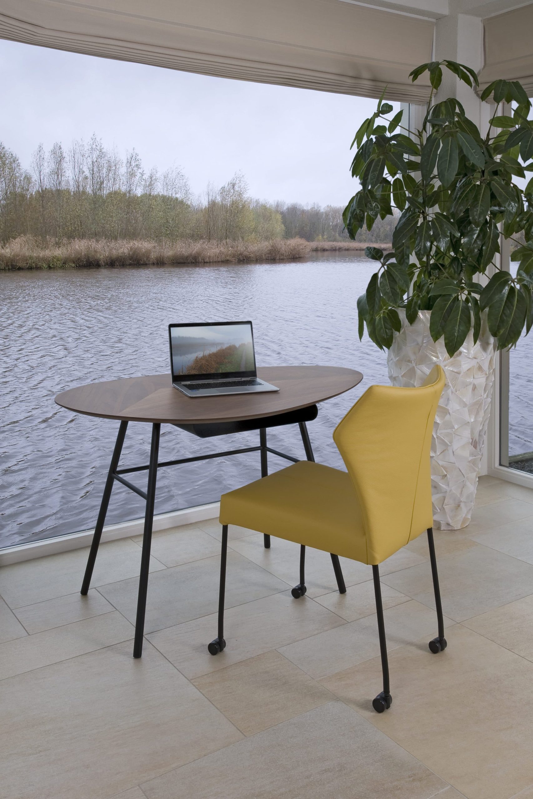 De stoel kan gestoffeerd worden in eindeloos veel kleuren. Dit kan zelf met een combinatie van stof en leer. Het onderstel kan ook aangepast worden: met of zonder wieltjes.