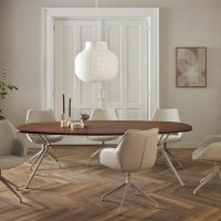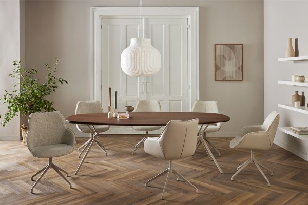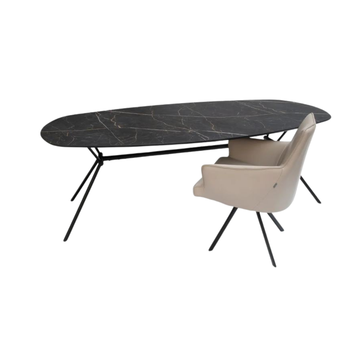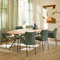 De Deense ovale eettafel Freya is een slanke design tafel voor de moderne eetkamer. Het deens ovale tafelblad heeft chique afgeronde zijkanten welke in combinatie met het lichte, zwart metalen onderstel en ruimtelijke uitstraling geeft aan uw eetkamer. Het tafelblad van de Freya is in vele materialen leverbaar en tot een lengte van 297 cm. Hierdoor past de tafel heel mooi in een grote ruimte.