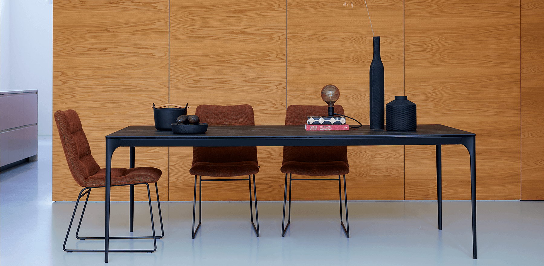 De Kyono heeft een strak ontwerp met een dun keramiek blad dat een subtiel zwevend effect geeft. De tafel is daarnaast ook verkrijgbaar met een massief houten blad. Dankzij de slanke poten behoudt de tafel een elegant en luchtig karakter, waardoor hij in veel interieurs prachtig tot zijn recht komt.