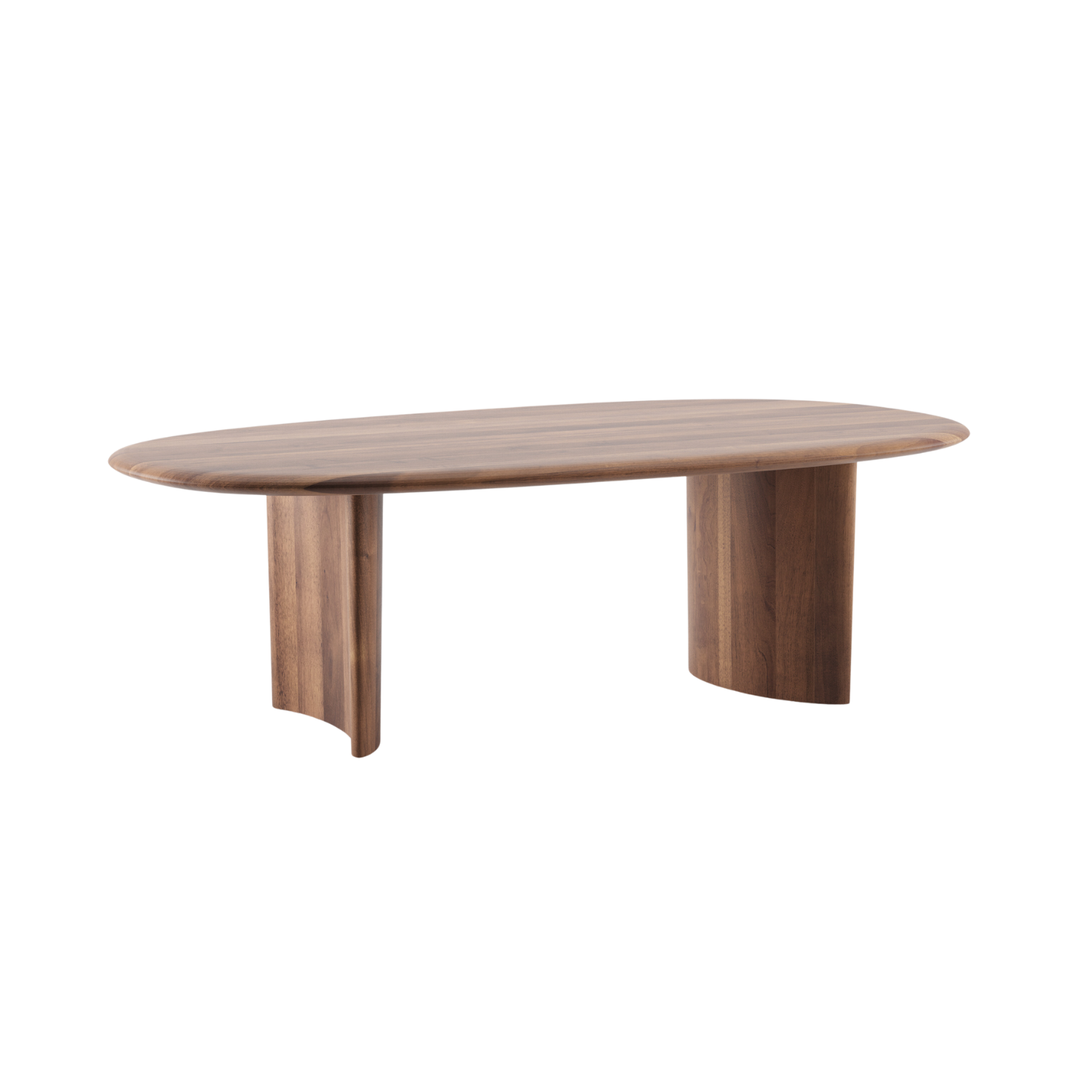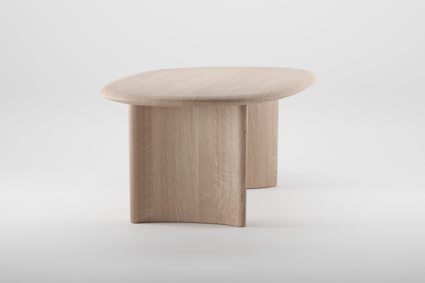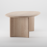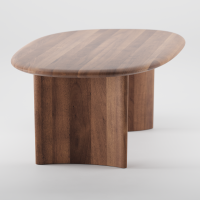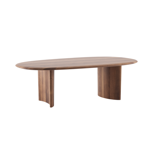 Gemaakt van duurzaam geproduceerd massief hout, straalt de tafel zowel kracht als verfijning uit. Het unieke blad en de schuin geplaatste poten geven het geheel een dynamische uitstraling, die vanuit elke hoek verrast.