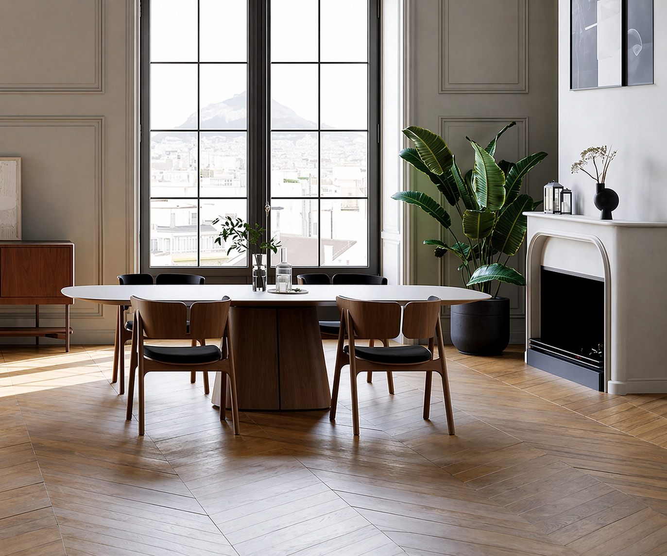 De eetkamertafel Tessera 001 van het Griekse merk Al2 heeft een Deens-ovale vorm en een stoer, elegant onderstel van gebogen multiplexplaten. Het blad is verkrijgbaar in hout, lak, keramiek of marmer. Kom naar onze winkel en stel je tafel zelf samen met verschillende afwerkingen en formaten, zodat deze perfect bij jouw interieur past.