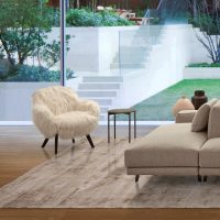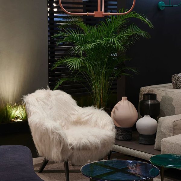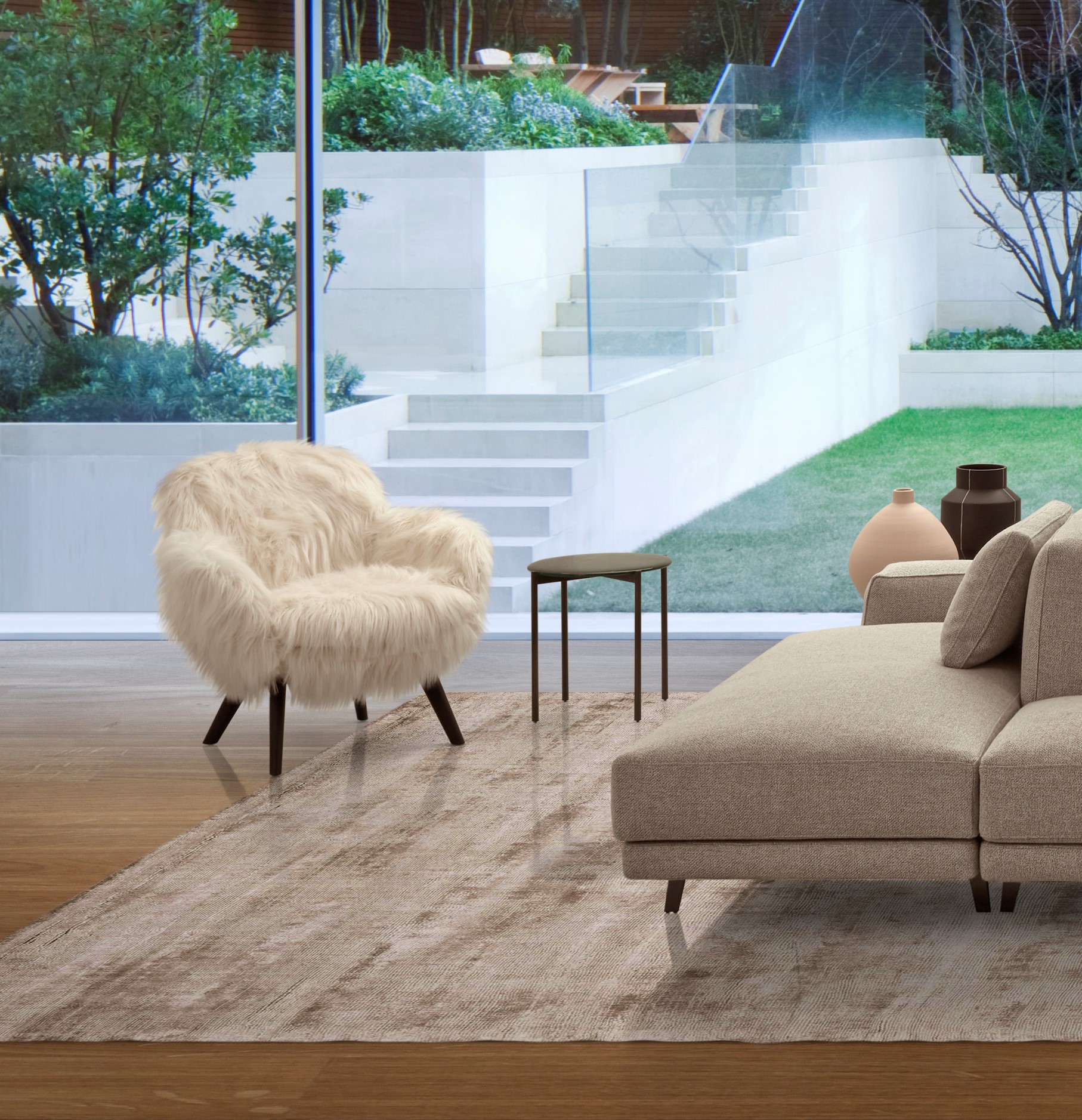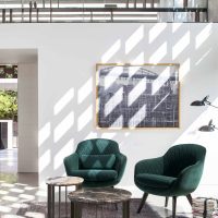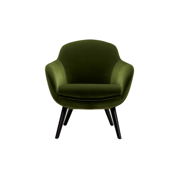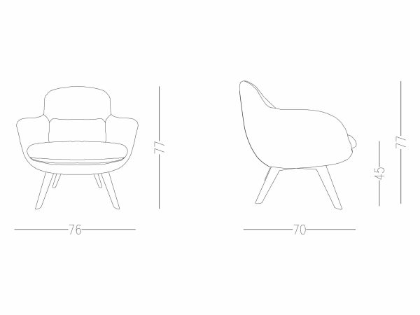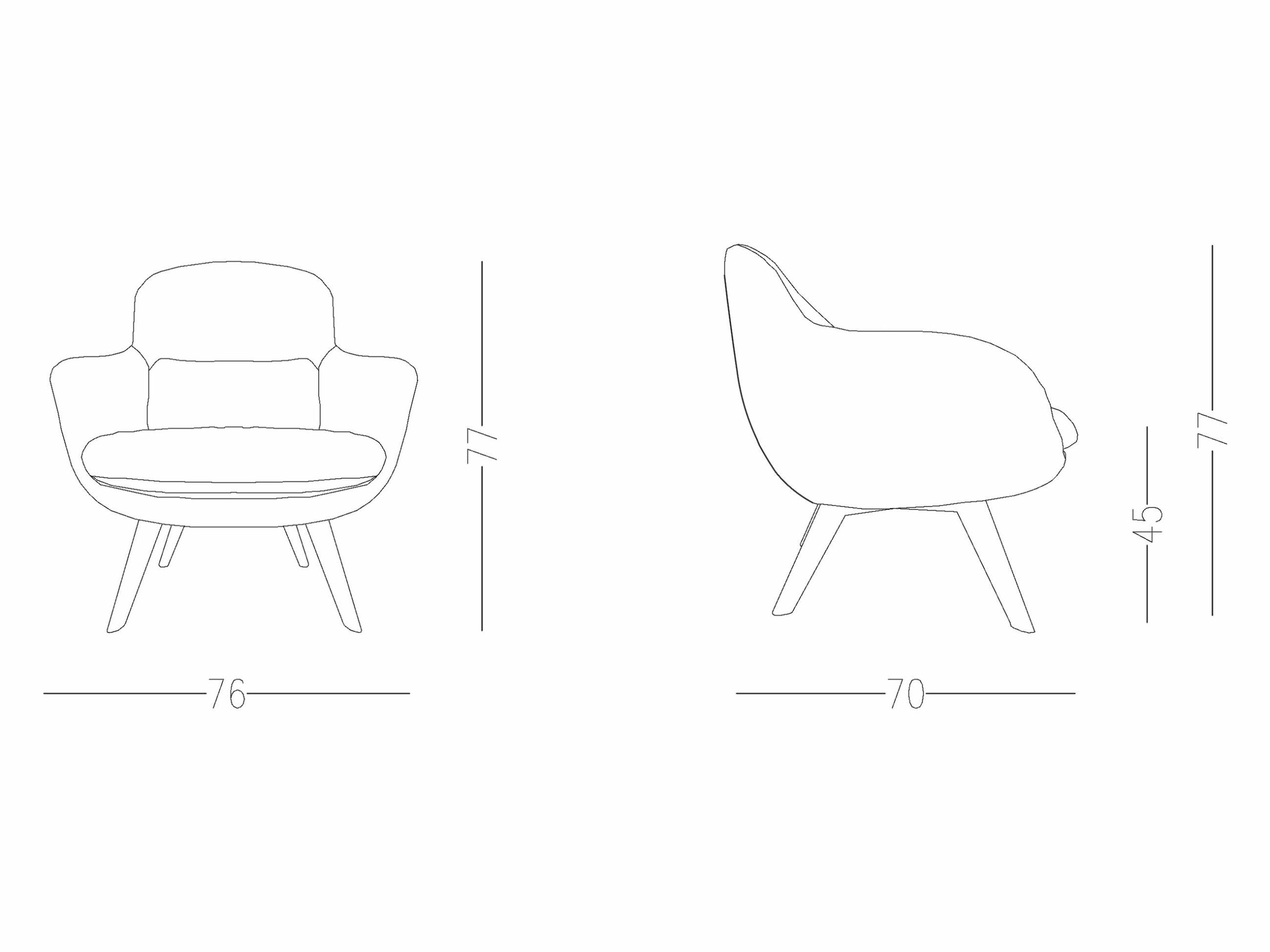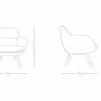 Een leunstoel die wordt gekenmerkt door zijn rondingen en vloeiende lijnen. Gemaakt van polyurethaan schaal en massief houten poten. Verkrijgbaar met of zonder lende kussen.