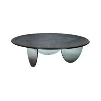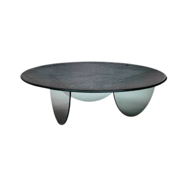De ronde vorm van het blad wordt versterkt door het unieke ronde onderstel van de tafel, wat eveneens van glas is gemaakt.