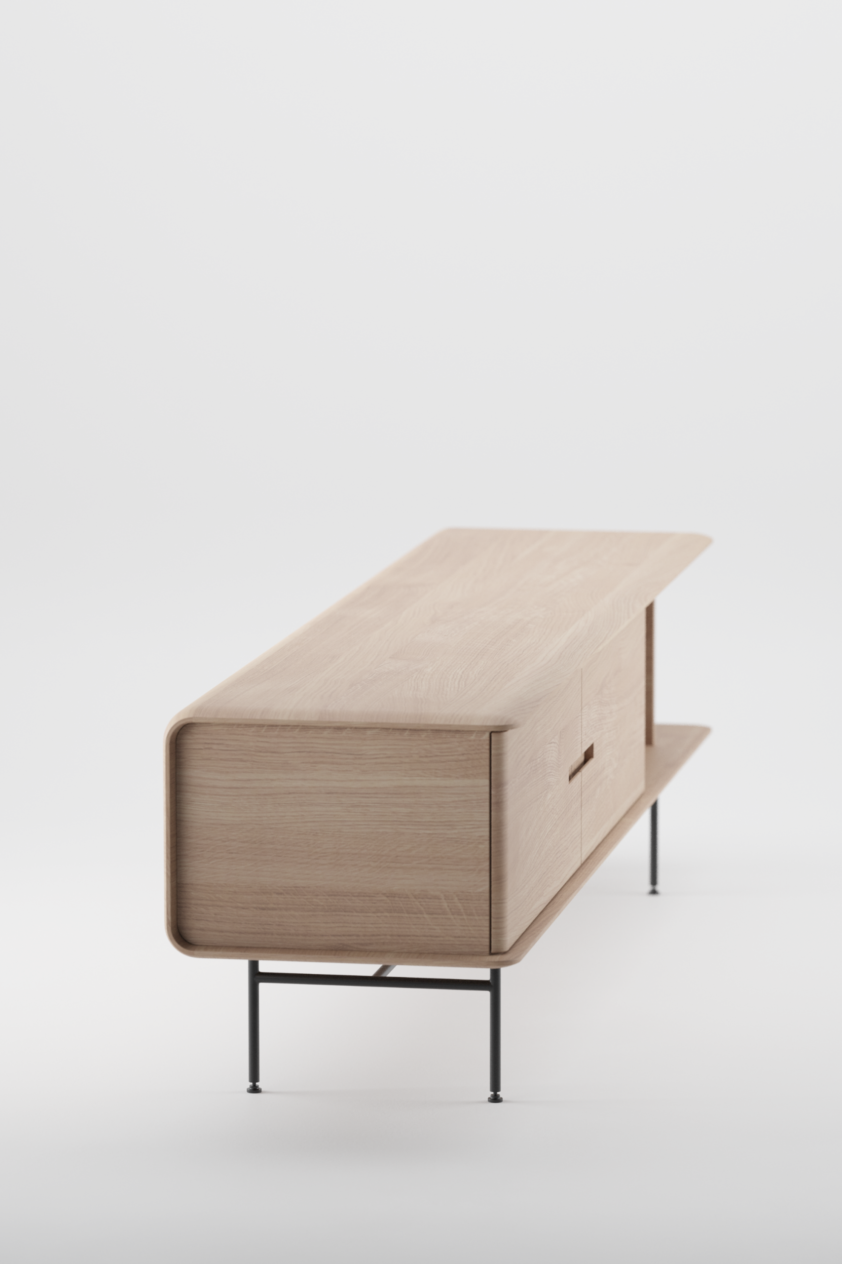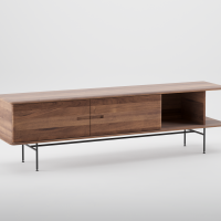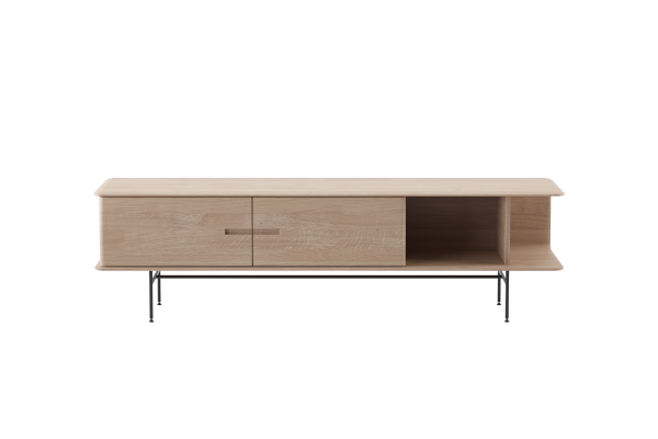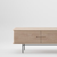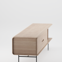 Het Leno Dressoir, ontworpen door Michael Schneider, combineert hout en staal voor een industriële uitstraling. De handgrepen zijn vakkundig in de deuren uitgesneden en de afgeronde hoeken geven het dressoir een zachte look. Open vakken bieden ruimte voor decoratie, terwijl het slanke metalen onderstel met zwarte poedercoating zorgt voor een verfijnde afwerking.