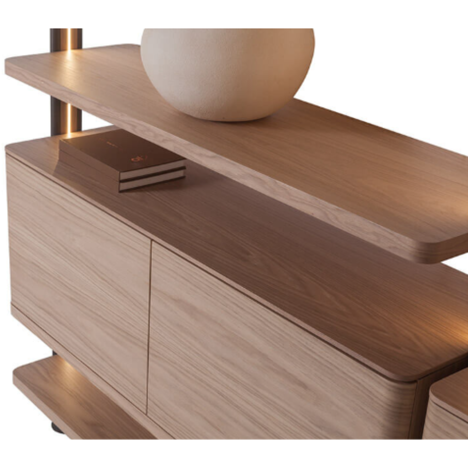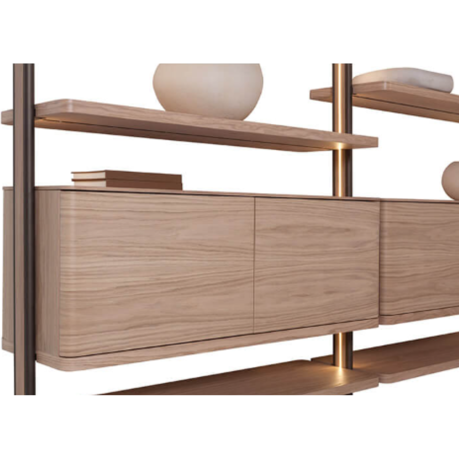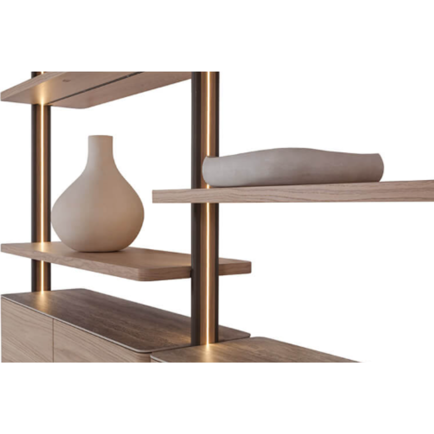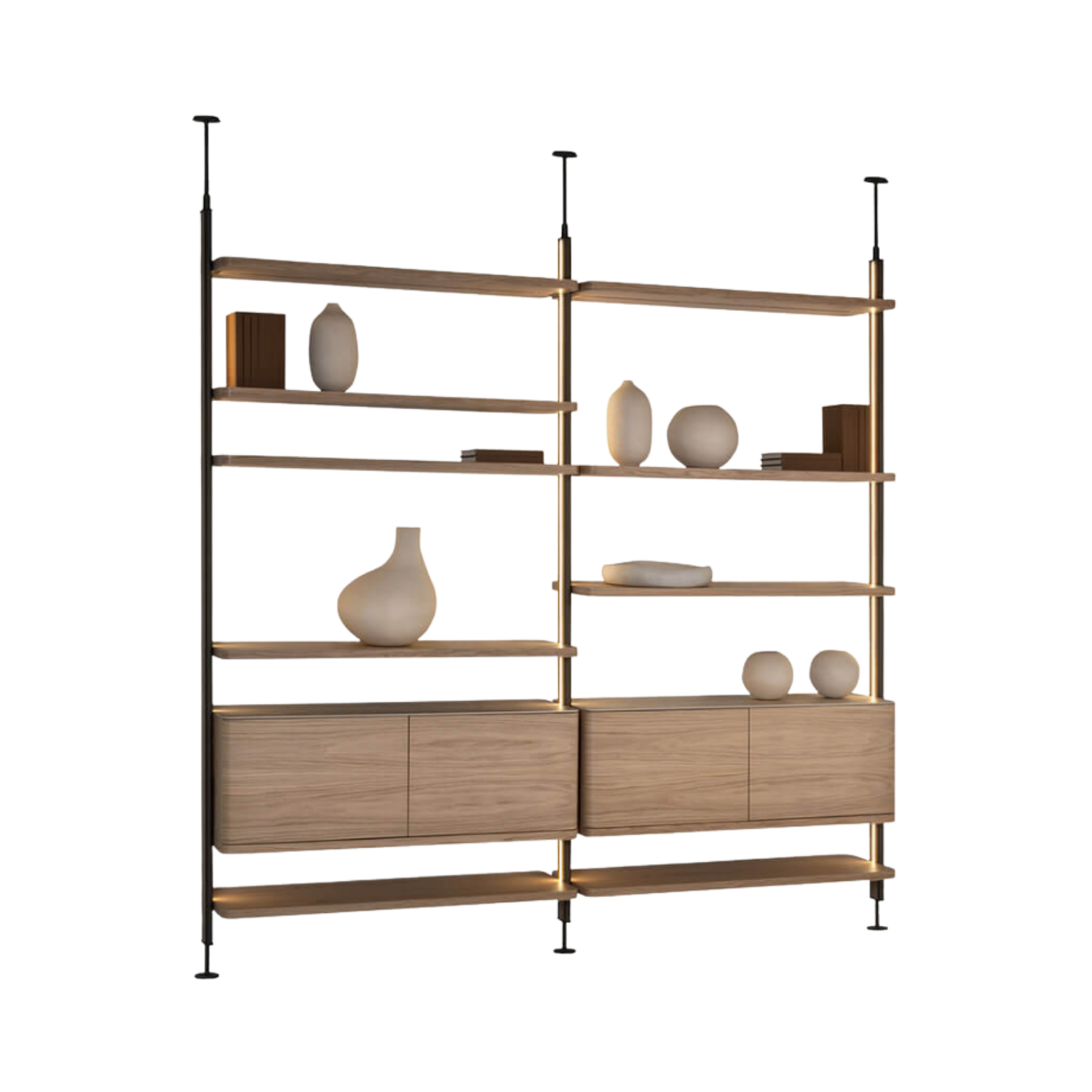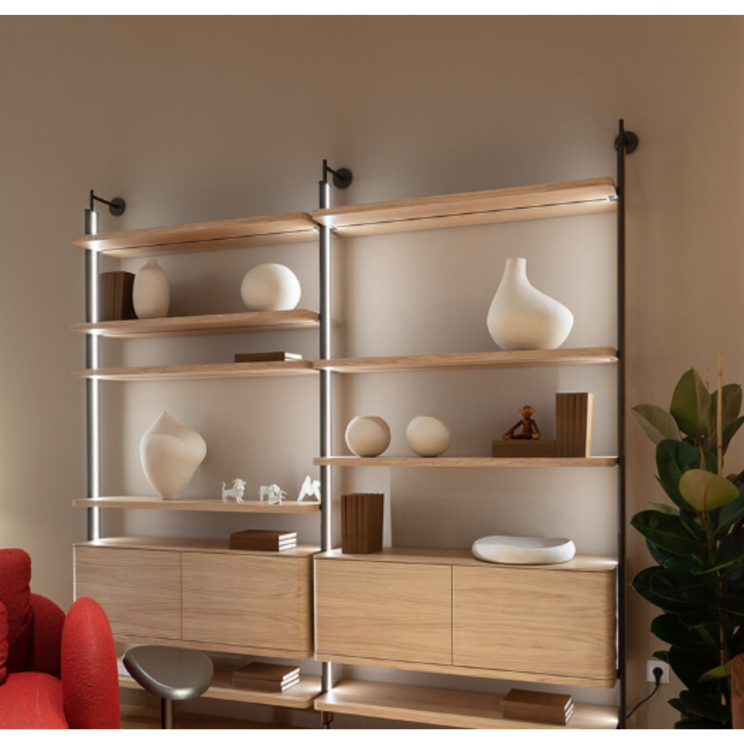 Het Muse kastensysteem is ontworpen om elegantie, functionaliteit en veelzijdigheid samen te brengen. De kolommen, uitgevoerd in massief hout en metaal, zijn voorzien van geïntegreerde LED-verlichting en verkrijgbaar in twee hoogtes. De planken zijn beschikbaar in verschillende afmetingen, waardoor het systeem volledig naar wens samen te stellen is.
