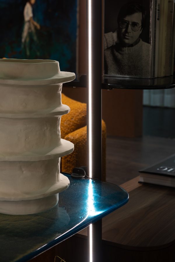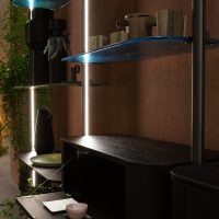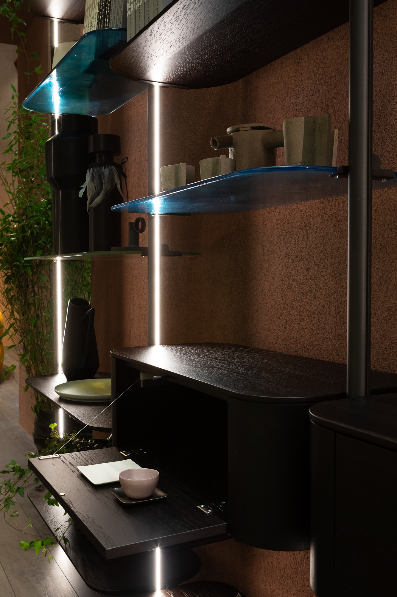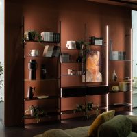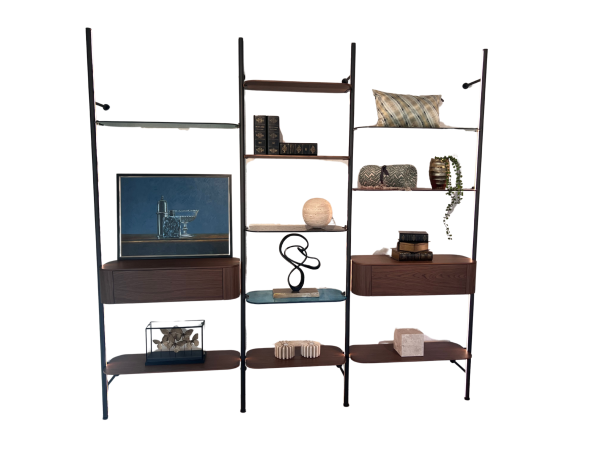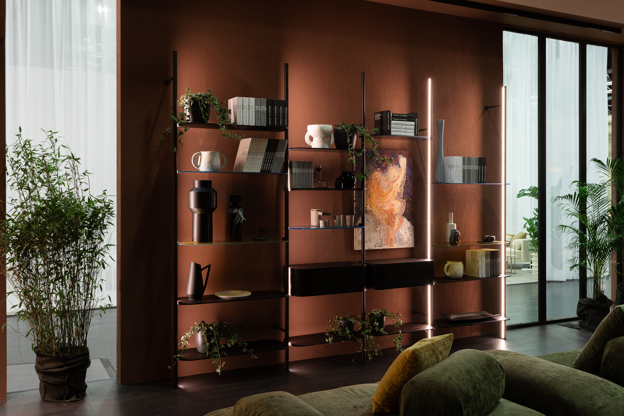 Amadore is een verfijnd en flexibel designstuk dat moeiteloos in elke ruimte past. Bevestig het aan de muur of plaats het als kamerverdeler van vloer tot plafond. Het slanke aluminium frame gecombineerd met luxueus Murano-glas of planken van eiken- of walnotenhout, straalt pure klasse uit. Volledig aanpasbaar voor een opstelling die perfect aansluit bij jouw stijl.